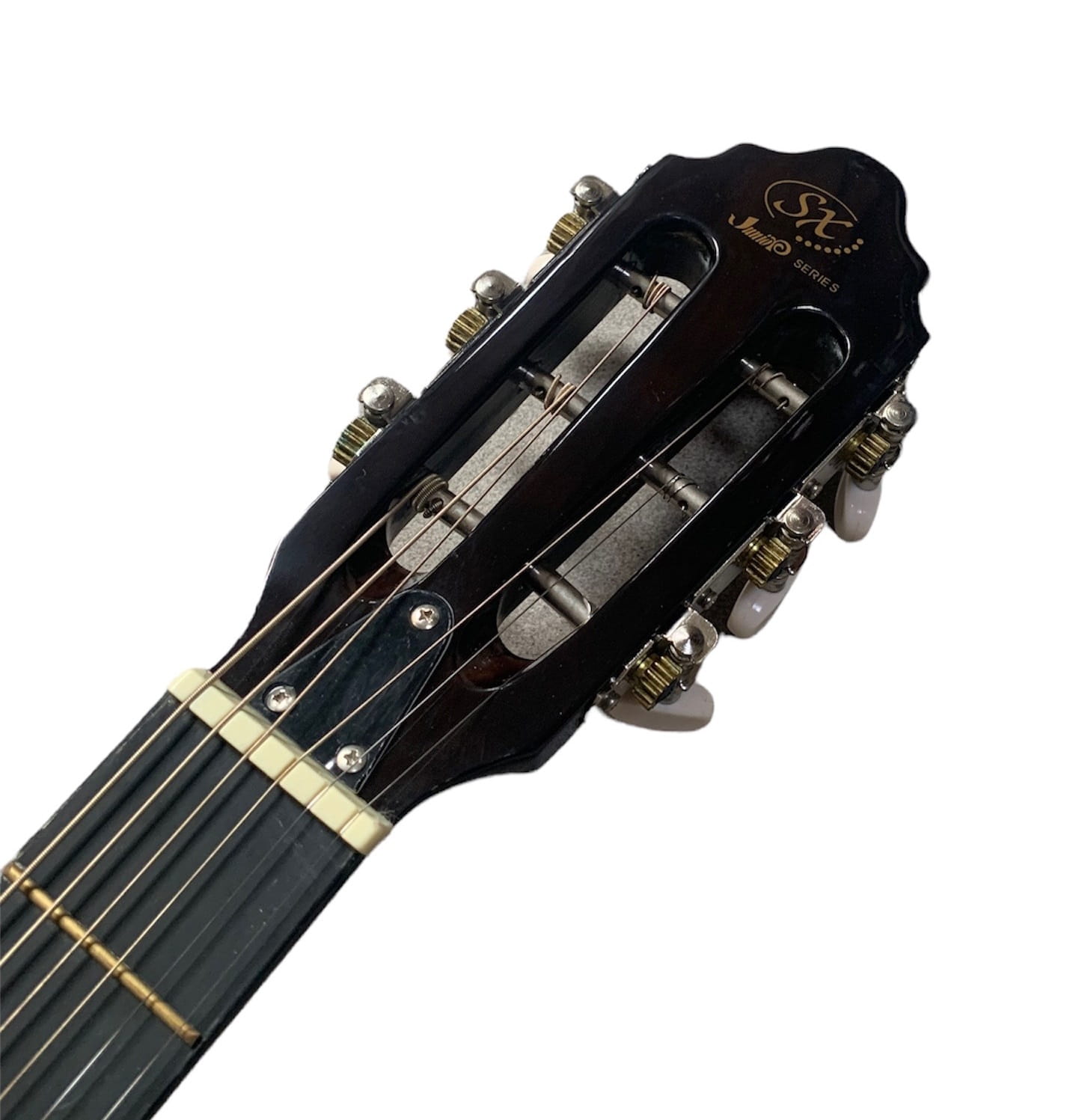 SX Junior SB ma korpus o rozmiarze i kształcie gitary klasycznej, co oznacza, że jest nieco mniejszy od standardowych akustyków dreadnought. Ta cecha czyni go praktycznym wyborem dla podróżujących, umożliwiając łatwe zabranie go na wycieczki. Wąski i dobrze wyprofilowany gryf przypomina gryfy akustyczne, zapewniając wygodę podczas gry. Na główce, która również przypomina klasyka, zamontowane są vintage'owe klucze z metalowymi tulejkami. Wewnątrz gryfu znajduje się pręt, który wzmacnia konstrukcję i umożliwia dostosowanie akcji strun.