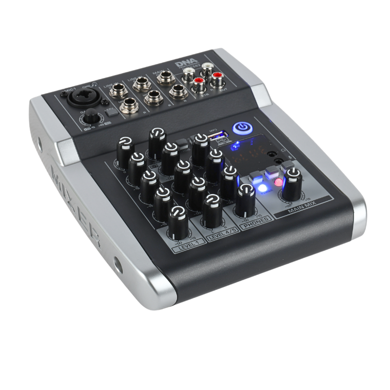 DNA QMX402 został zaprojektowany z myślą o maksymalnej wygodzie użytkownika. Oferuje wejście combo (XLR/jack 6,35 mm), dwa wejścia mono oraz dwa RCA (2TR), co pozwala podłączyć mikrofon, instrument, odtwarzacz lub konsolę DJ. Każdy kanał ma osobne pokrętła regulacji głośności, wzmocnienia i korekcji. Dzięki złączom USB-B i USB-C mikser można podłączyć do komputera lub zasilać z dowolnego źródła 5V.