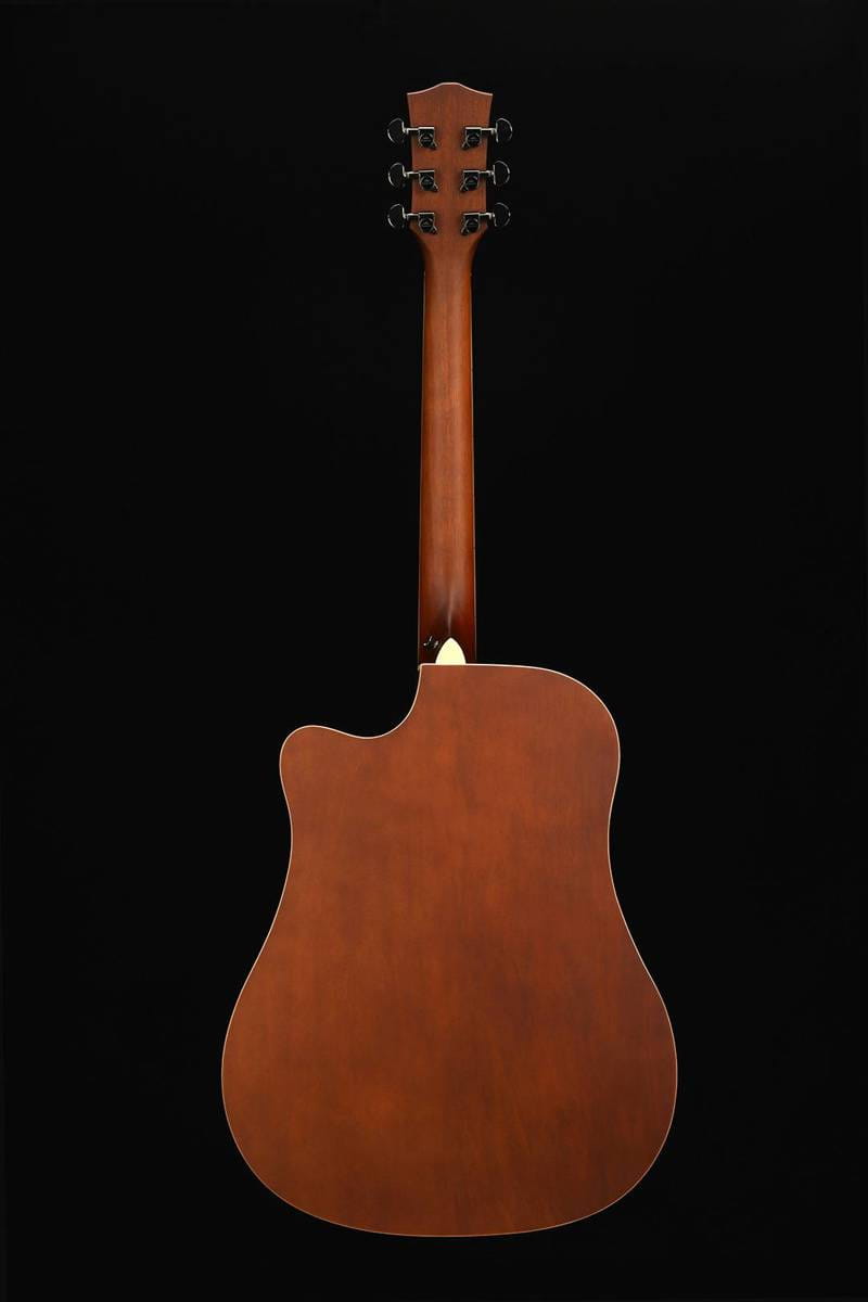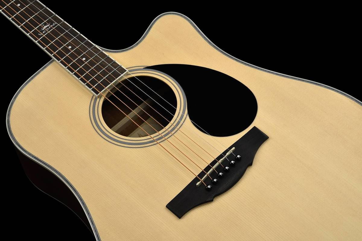 Korpus: Dreadnought, laminat świerku Sitka na płycie wierzchniej oraz laminat brzoskwini Kauri na bokach i tyle.