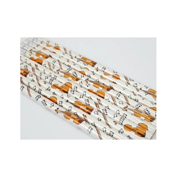 Uroczy ołówek w perłowym kolorze ozdobiony pięknym wzorem skrzypiec i nut. Posiada gumkę, co czyni go praktycznym dodatkiem do piórnika. Idealny dla młodych muzyków, a zwłaszcza dla uczniów grających na skrzypcach. Doskonały pomysł na mały prezent dla każdego pasjonata muzyki, który ceni zarówno funkcjonalność, jak i estetykę.
