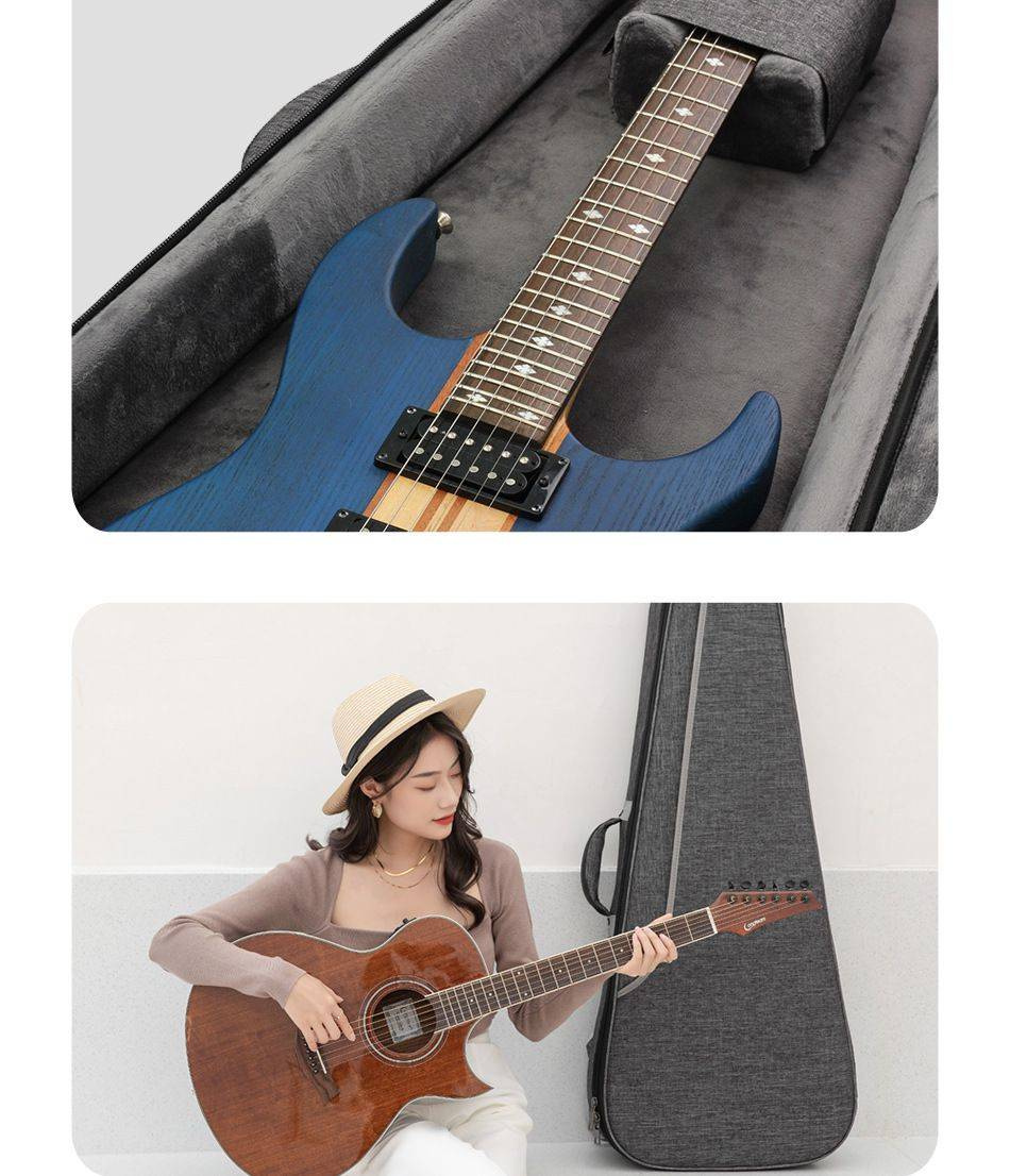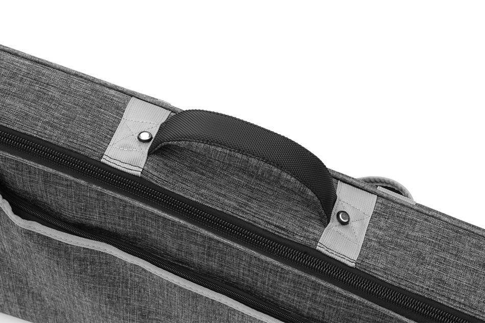 Ergonomiczna konstrukcja z regulowanymi szelkami pozwala wygodnie nosić pokrowiec jak plecak, a podpórka pod gryf utrzymuje instrument w stabilnej pozycji. Szary kolor i solidny zamek błyskawiczny nadają całości elegancki, profesjonalny wygląd.