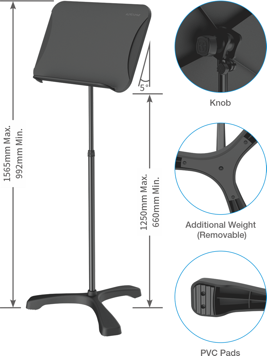 Pulpit wyposażono w elastyczne metalowe ramiona, które pewnie utrzymują nuty i książki, a prosty montaż w systemie „bracket” pozwala na szybkie składanie i rozkładanie. Lekka, przenośna konstrukcja wykonana z wytrzymałego PCV i stali umożliwia łatwy transport, a cicha praca materiałów nie zakłóca gry.