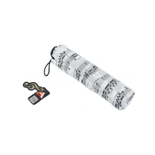 Oryginalny, czarno-biały parasol składany z eleganckim nadrukiem nut na pięciolinii. Dzięki średnicy ok. 100 cm skutecznie chroni przed deszczem, a jego kompaktowy rozmiar sprawia, że bez problemu zmieści się w torebce lub plecaku. Wyposażony w uchwyt wykonany w technologii soft touch dla większego komfortu użytkowania. Idealny dla muzyków i miłośników muzycznych akcentów w codziennych dodatkach.