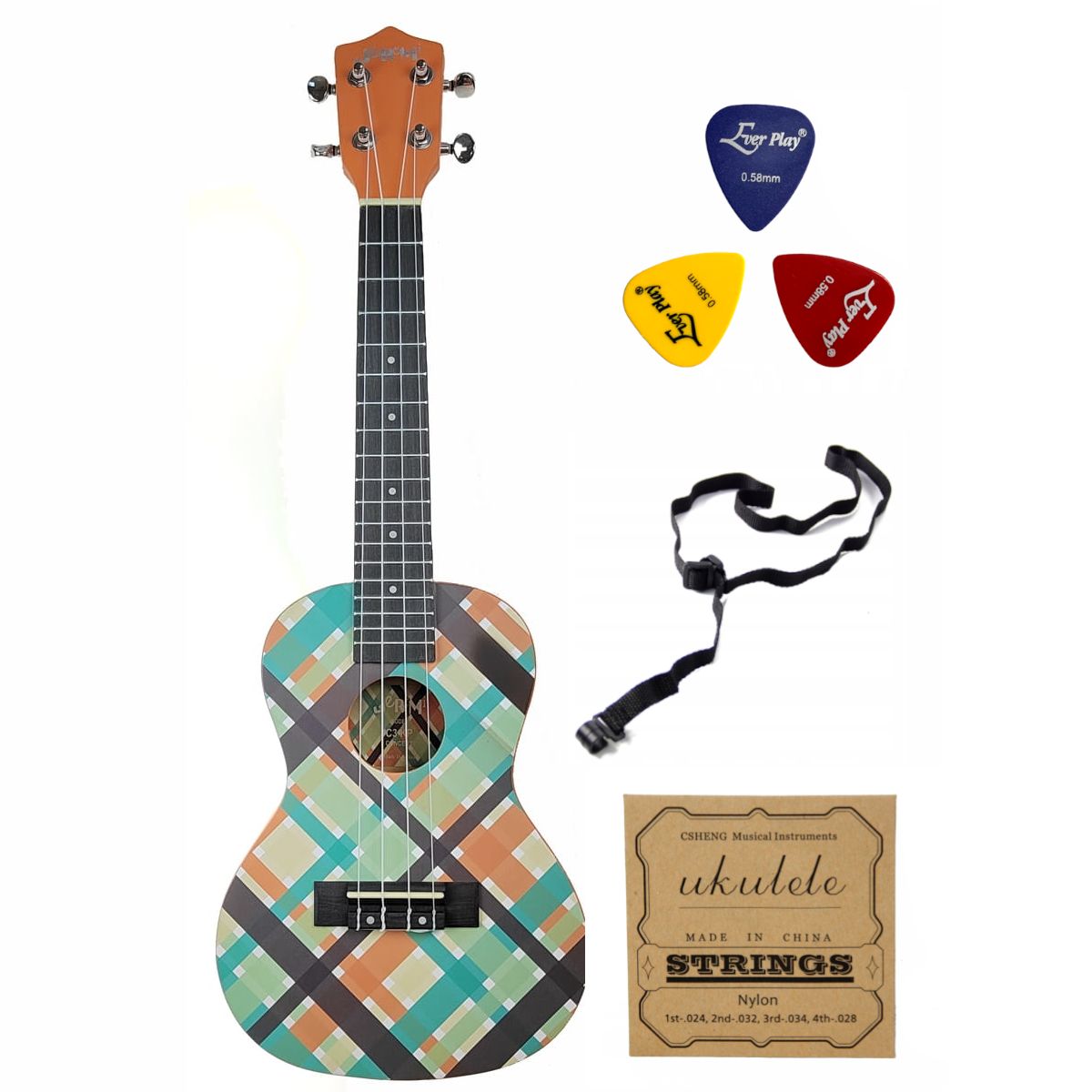 Ukulele Koncertowe Kolorowa Krata Jeremi C3-KP + Akcesoria