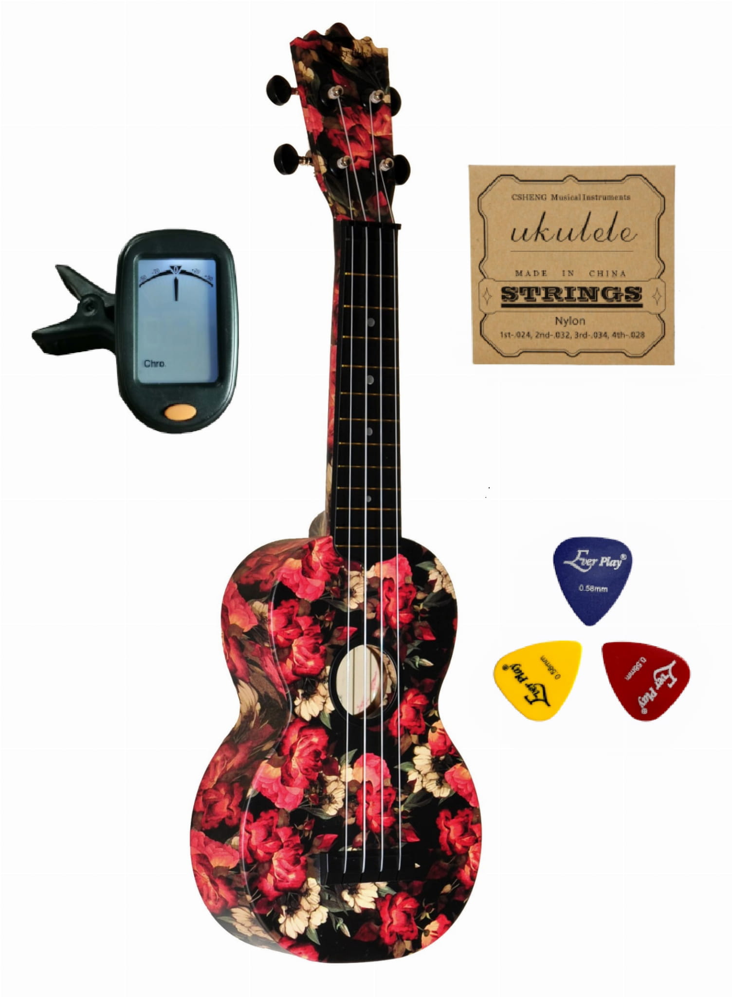 Ukulele Sopranowe Ever Play Carbono Róże Zestaw kostki struny tuner